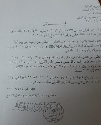 إعلان لبيع رنج خاص بإتحاد بلديات وسط وساحل القيطع بالمزاد العلني.