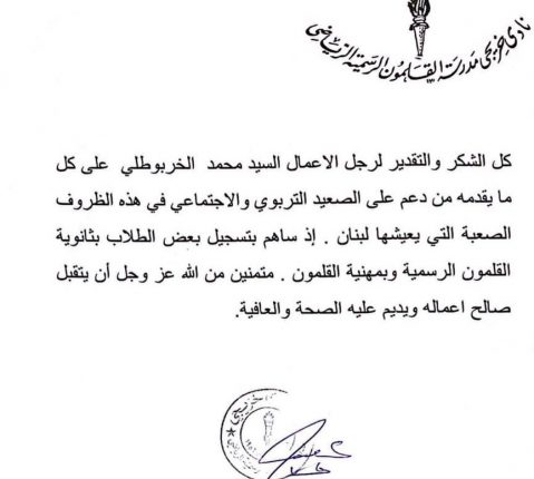 وجه نادي خريجي مدرسة القلمون الرسمي الرياضي، كتاب شكر الى الرئيس الفخري لنادي القلمون الرياضي محمد الخربوطلي،لمساهمته في تسجيل طلاب في ثانوية القلمون الرسمية ومهنيتها. ونوّه الكتاب بهذه المساهمة التي تأتي في ظل هذه الظروف الصعبة التي يعيشها لبنان. ومن جهته، أكد الخربوطلي: أن الوقوف الى جانب الأهالي في تعليم أبنائهم، هو واجب يجب […]