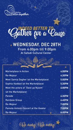تحت عنوان لنعيد الميلاد fêtez Noël احتفلت جمعية تدبير بتنظيم ضيعة ميلادية لمدة اربعة ايام متتالية في بلدة عندقت العكارية بالتعاون مع ابناء البلدة وبمشاركة جمعيات البلدة من اخوية شبيبة العذراء وكشافة لبنان والتعاونية النسائية للمنتجات التقليدية ومؤسسات تجارية حيث اقيمت الاحتفالات المميزة من العاب ومسرحية ميلادية للاطفال وريسيتالات ميلادية بحضور عدد كبير من […]
