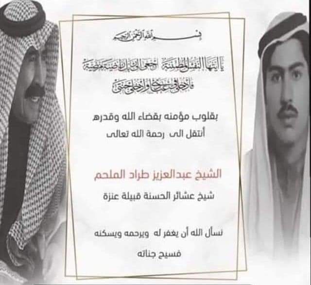رحم الله شيخ #عبد_العزيز_طراد_الملحم تعازينا الحارة لأبنائه ولعموم عشيرة #الحسنة خاصةً وقبيلة #عنزة عامةً