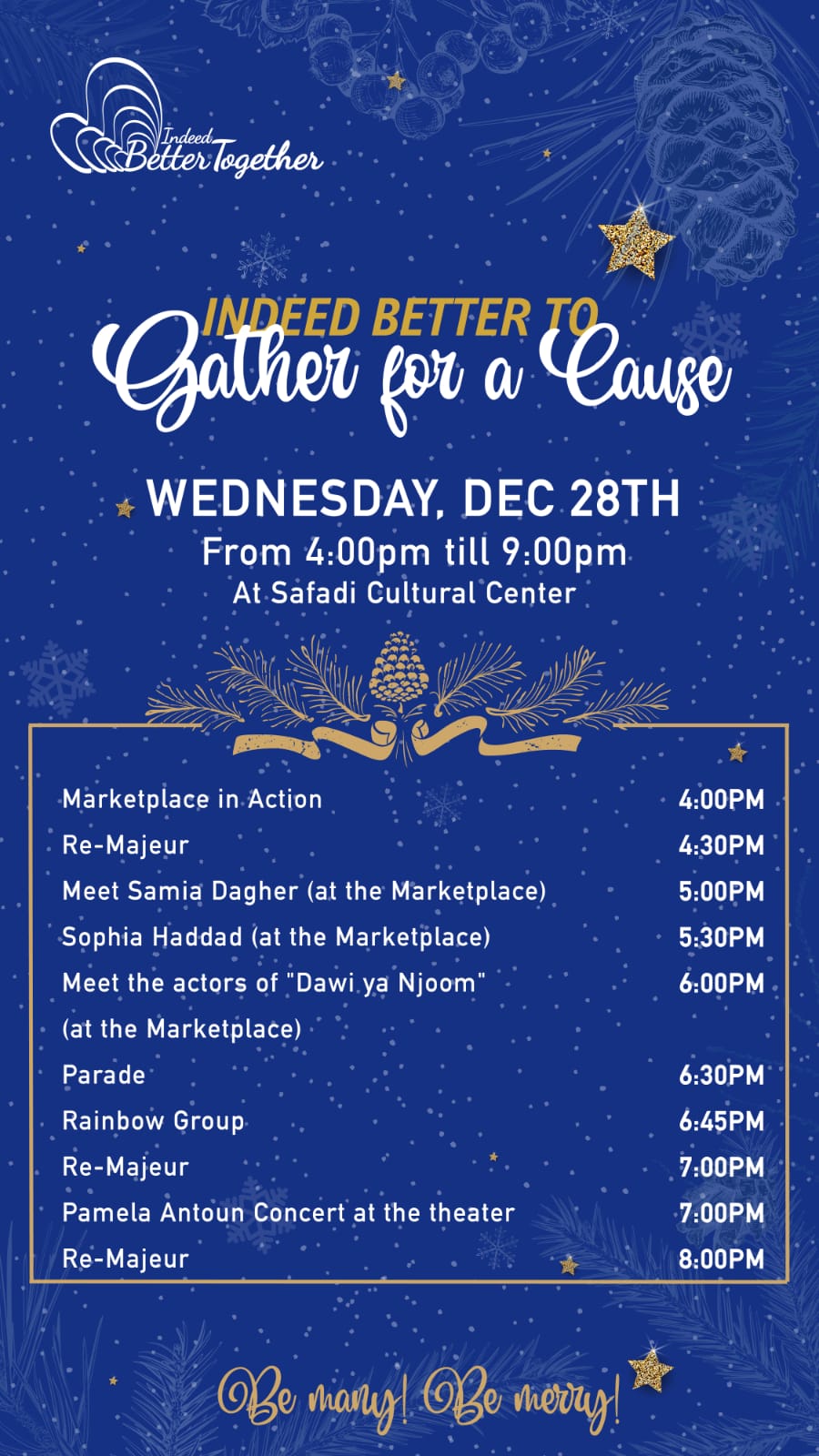 ويتضمّن النشاط العديد من الفعاليات. حيث يبدأ رسميًا عند الرابعة والنصف بأنشطة منوّعة منها الفنية والثقافية والصحية والعديد من المواهب وفقرات منوّعة، ومنها الريسيتال الميلادي المسرحي الأول للفنانة باميلا انطون، في يوم النشاط الثاني، على أن يعود ريع هذا النشاط بكامله لدار اليتيمة الإسلامية وجمعية حاملات الطيب، في تأكيد على العنوان الأساسي الذي اتّخذته الجمعية للنشاط وهو “أكيد فينا سوا .. نجتمع لأجل الخير ولأجل الإنسان”. لا ننسى أن نشير أنه وعندما يشجِّع القادرون من الطرابلسيين مواهب من المدينة ويذهب ريع الإحتفالات إلى دُور عجزة ودُور أيتام، يكون الناس “أكيد سوا” من أجل دعم بعضهم البعض للإستمرار وعدم الاستسلام، وتشجيع الشباب للبقاء في أرضهم وعدم التطلّع دائمًا نحو الهجرة.